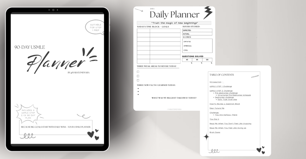 Struggling to stay consistent with your USMLE prep? The 90-Day USMLE Planner has everything you need! With trackers, motivational quotes, and self-reflection prompts, it keeps you focused and on track. It even includes both dedicated and pre-dedicated step 2 CK schedules to guide your studies!